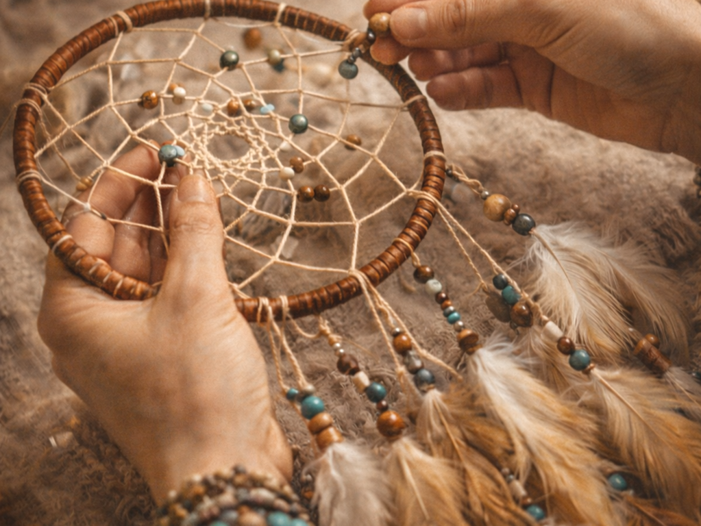 Ручка и плетение выполняются в форме ловца снов с нитями, бусинами, перьями и колокольчиками.